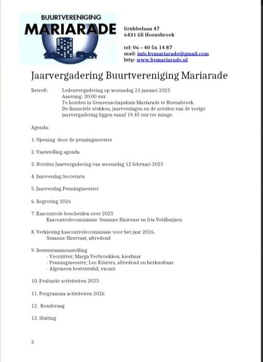 Wij nodigen u hartelijk uit tot het bijwonen van onze ledenvergadering op woensdag 21 januari 2025 Aanvang: 20.00 uur. Te houden in Gemeenschapshuis Mariarade te Hoensbroek. De financiële stukken, jaarverslagen en de notulen van de vorige jaarvergadering liggen vanaf 19.45 uur ter inzage.